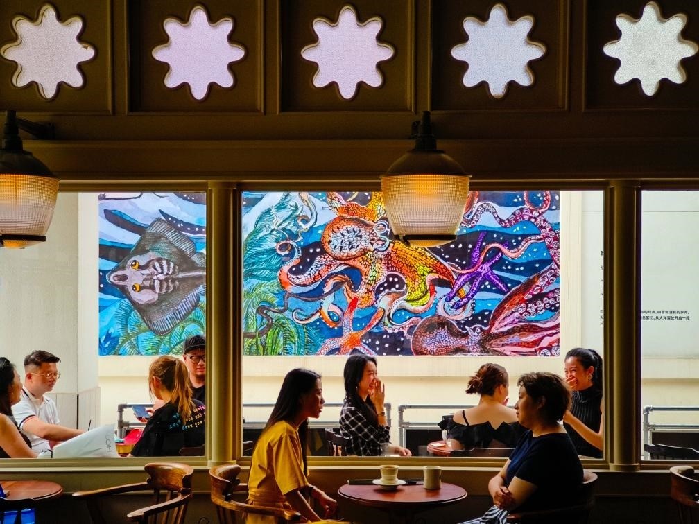 人們?cè)诔啥即笤粗醒牍珗@的Regular·源野生活空間內(nèi)的咖啡館里休閑