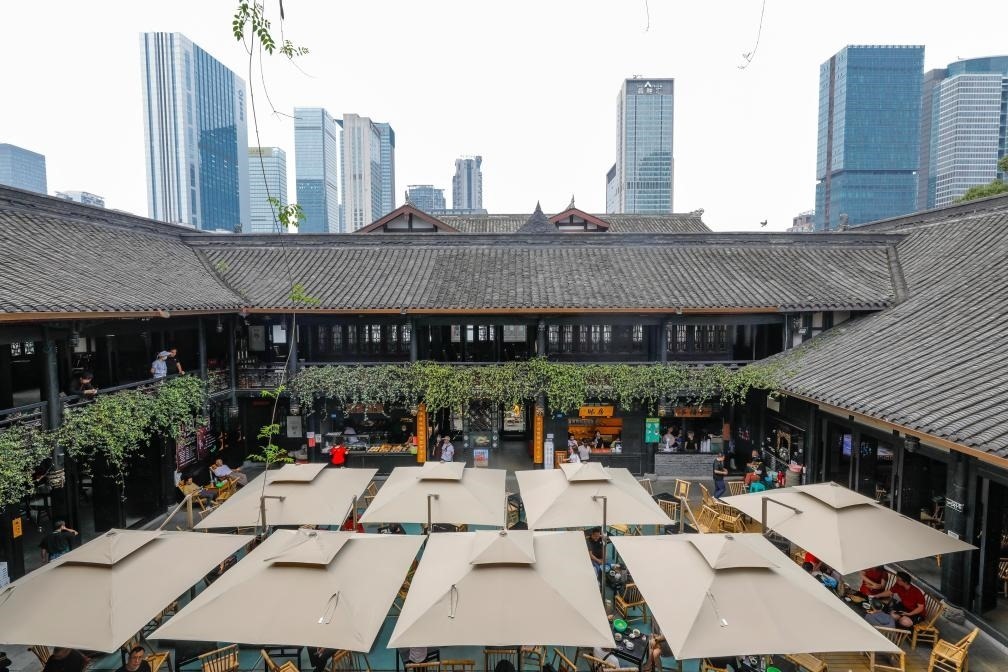 人們?cè)诔啥继爬锎蟠人聝?nèi)的茶社喝茶、休閑,不遠(yuǎn)處高樓林立