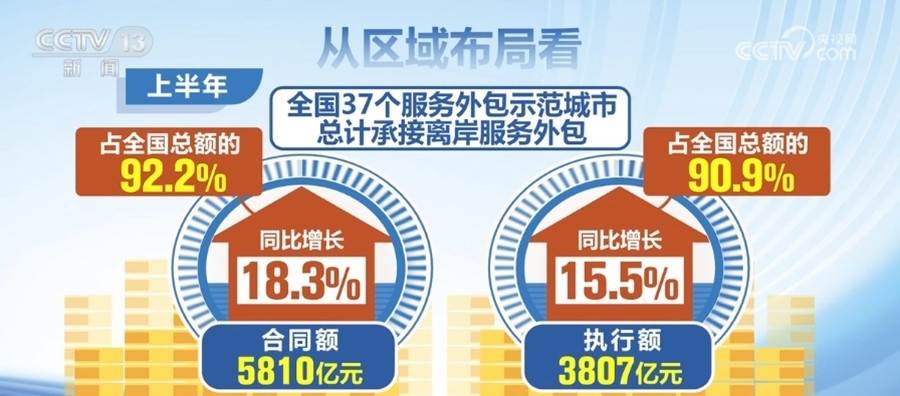從區(qū)域布局看,上半年,全國(guó)37個(gè)服務(wù)外包示范城市總計(jì)承接離岸服務(wù)外包合同額5810億元,執(zhí)行額3807億元,同比分別增長(zhǎng)18.3%和15.5%,分別占全國(guó)總額的92.2%和90.9%。