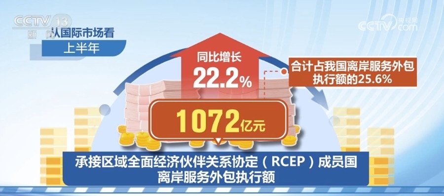 從國(guó)際市場(chǎng)看,上半年,承接區(qū)域全面經(jīng)濟(jì)伙伴關(guān)系協(xié)定(RCEP)成員國(guó)離岸服務(wù)外包執(zhí)行額1072億元,同比增長(zhǎng)22.2%,合計(jì)占我國(guó)離岸服務(wù)外包執(zhí)行額的25.6%。