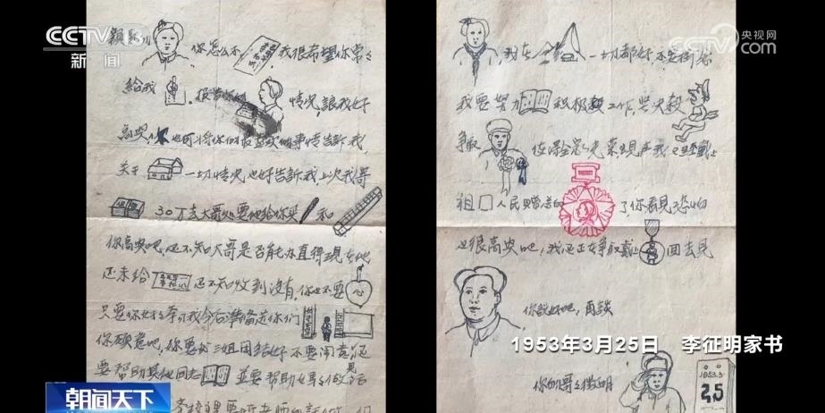 在戰(zhàn)火紛飛的年代,從戰(zhàn)場(chǎng)輾轉(zhuǎn)寄出的家書(shū)有很多很多。其中,有這樣一封特別的信,兩座小山包代表“上甘嶺”、一本書(shū)表達(dá)“讀書(shū)”、妹妹是一個(gè)戴著紅領(lǐng)巾的可愛(ài)小姑娘。泛黃的紙上,是充滿關(guān)切的文字和有愛(ài)的插畫(huà)。