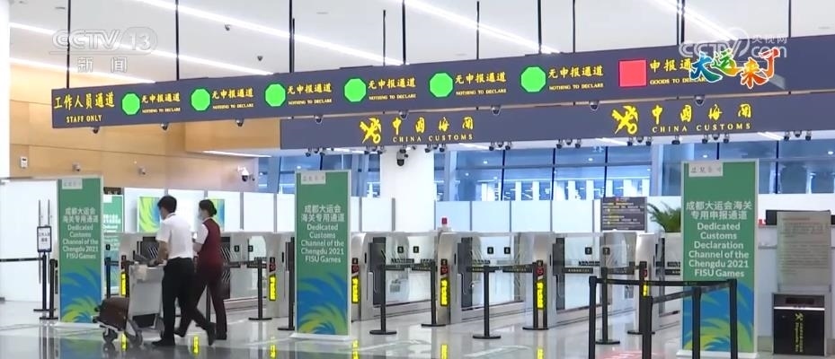 成都海關(guān)所屬雙流機場海關(guān)旅檢二科科長 李霄林:為了應對大運會人員集中通關(guān)的情況,我們設(shè)置了6條大運會海關(guān)專用通道,并對集成了手提行李機檢等8項功能的智能通道進行了升級,由原來的“單通道”升級為“雙通道”,單人的通關(guān)速度提升了40%。
