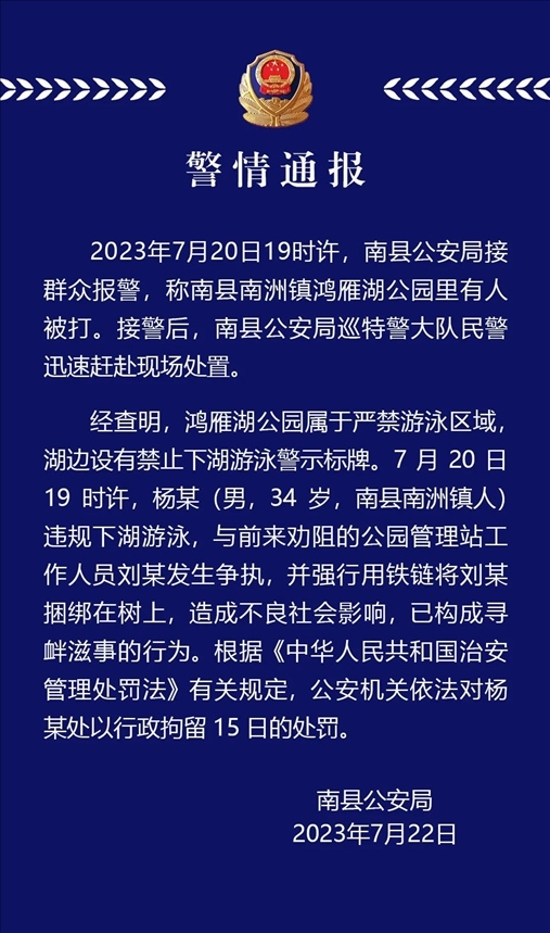·男子下湖游泳違規(guī)、將勸阻人員鎖在樹上,湖南益陽市南縣警方通報(bào)。