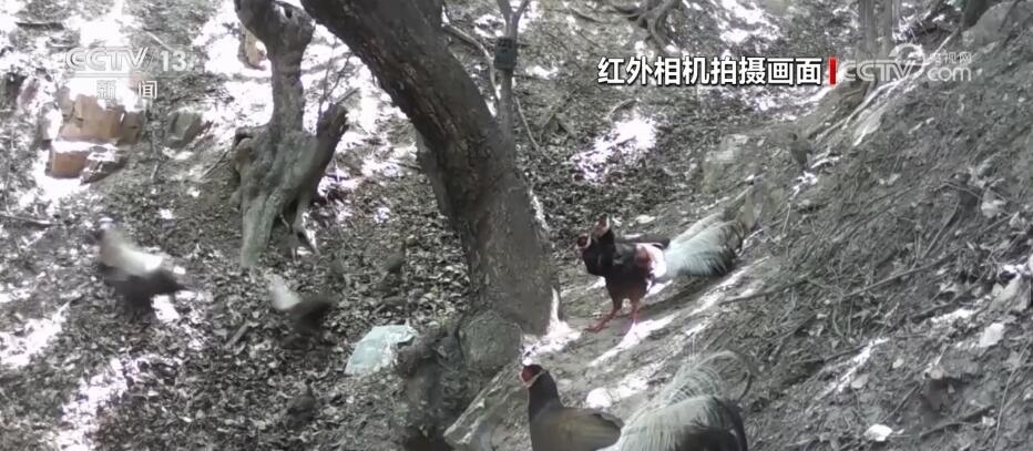 近日,在山西呂梁的孝義市國(guó)有林場(chǎng),紅外相機(jī)記錄到國(guó)家一級(jí)保護(hù)野生動(dòng)物褐馬雞最大種群。畫(huà)面中,先是兩群褐馬雞在兩棵老樹(shù)下覓食玩耍,兩個(gè)樹(shù)洞內(nèi)積有雨水,它們不斷地前往飲水補(bǔ)給。突然,一只落單的成年褐馬雞入侵,遭到領(lǐng)地一只雄性褐馬雞的追逐驅(qū)趕。不同角度的紅外相機(jī)還捕捉到褐馬雞好奇對(duì)視相機(jī)、幼崽上樹(shù)打鬧等趣味十足的珍貴影像。