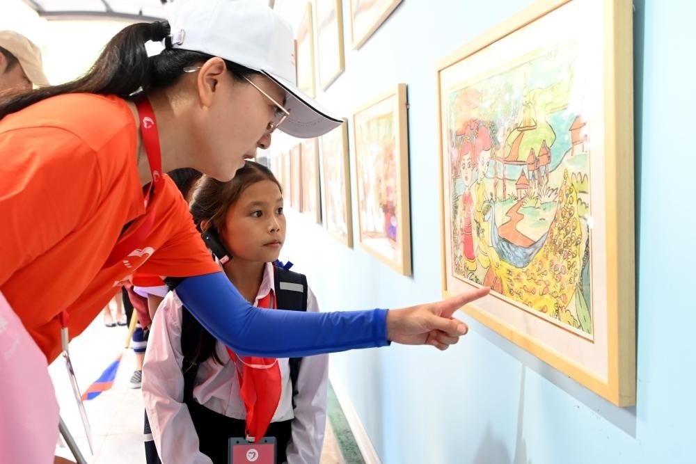 △2023年5月24日,乘坐中老鐵路國(guó)際旅客列車(chē)的百名老撾學(xué)生抵達(dá)中國(guó)云南西雙版納,和中國(guó)學(xué)生開(kāi)展聯(lián)誼活動(dòng)。圖為志愿者向老撾學(xué)生講解允景洪小學(xué)內(nèi)展出的學(xué)生畫(huà)作。