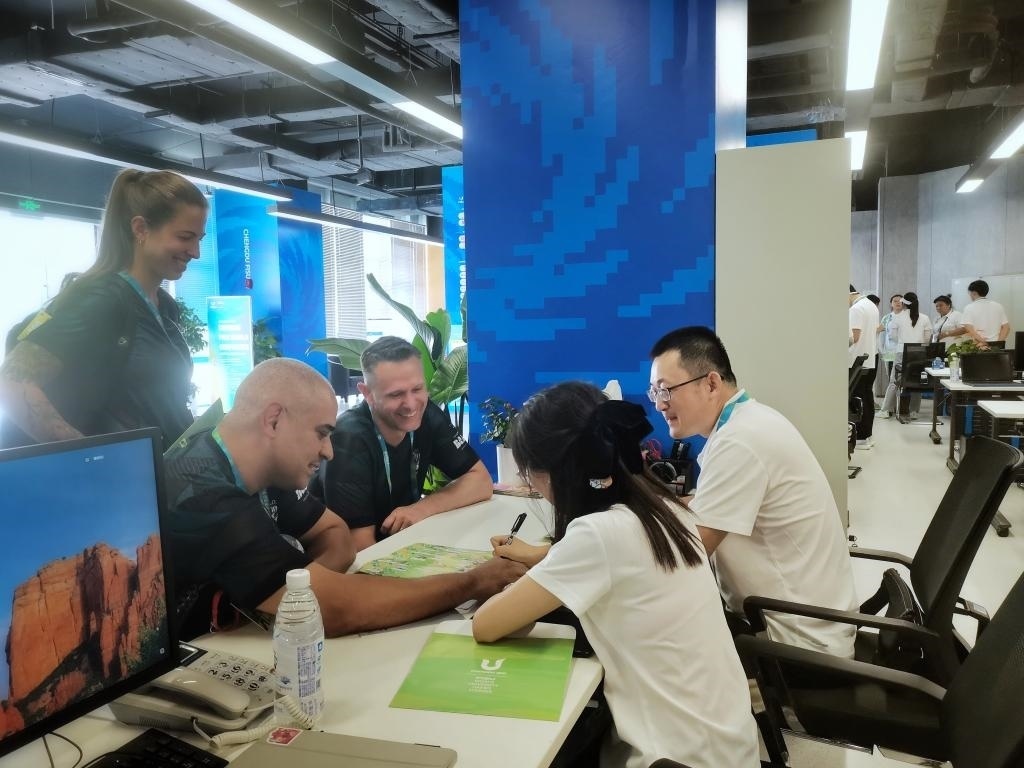 國外大學(xué)生代表團(tuán)成員在成都大運(yùn)村咨詢城市文化體驗(yàn)觀光線路活動(dòng)。受訪者供圖