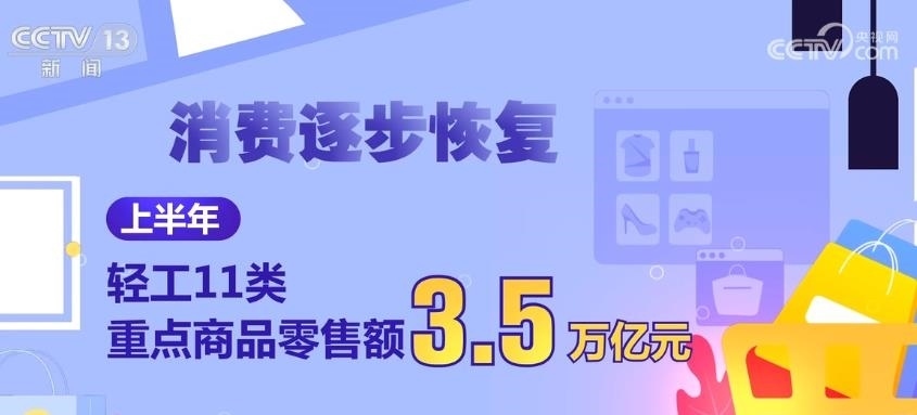 消費逐步恢復。上半年,輕工11類重點商品零售額3.5萬億元,占社會消費品零售總額的15.4%,同比增長6.3%。