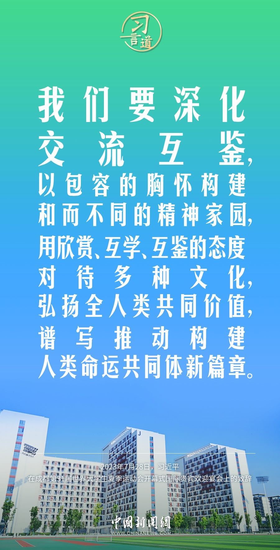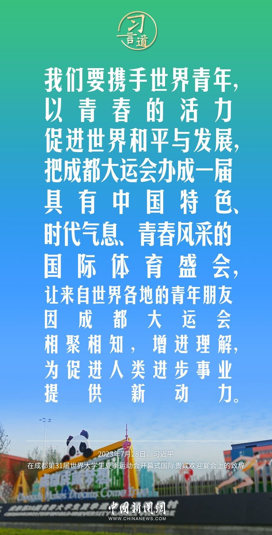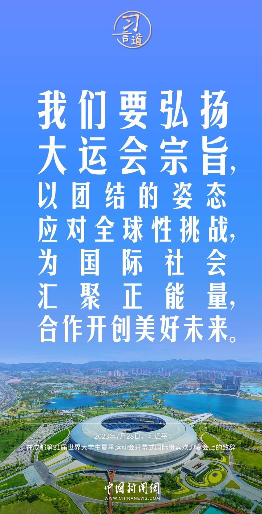 7月28日中午,國家主席習(xí)近平和夫人彭麗媛在四川省成都市金牛賓館舉行宴會,歡迎出席成都第31屆世界大學(xué)生夏季運(yùn)動會開幕式的國際貴賓。習(xí)近平發(fā)表致辭稱——