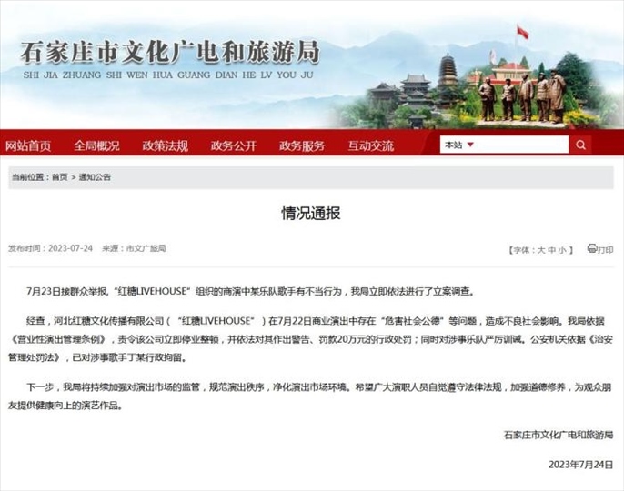 ·石家莊通報樂隊歌手商演不當行為:涉事者被拘,公司停業(yè)整頓。