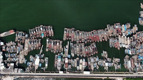 7月27日,廣東省潮州市饒平縣三百門漁港里回港避風(fēng)的漁船(無人機(jī)照片)。 新華社記者王瑞平攝