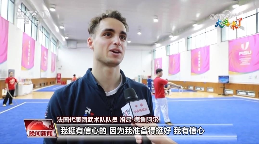 法國代表團(tuán)武術(shù)隊隊員 洛昂·德魯阿爾:我要比賽的項目是長拳和棍術(shù)。我每天都會訓(xùn)練,一天一般訓(xùn)練兩次。我挺有信心的,因?yàn)槲覝?zhǔn)備得挺好,我有信心。?