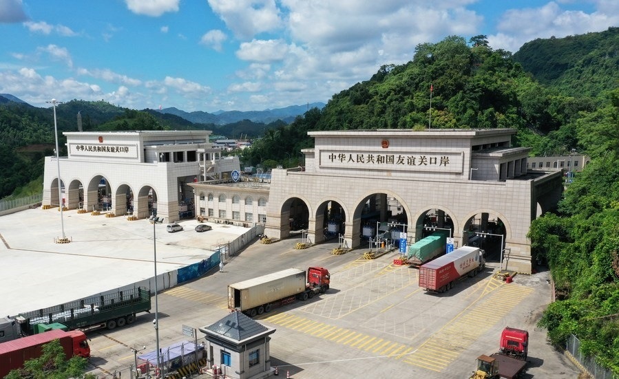 這是在廣西憑祥友誼關(guān)口岸通關(guān)的運(yùn)輸車(chē)輛(無(wú)人機(jī)照片)。新華社記者 楊馳 攝