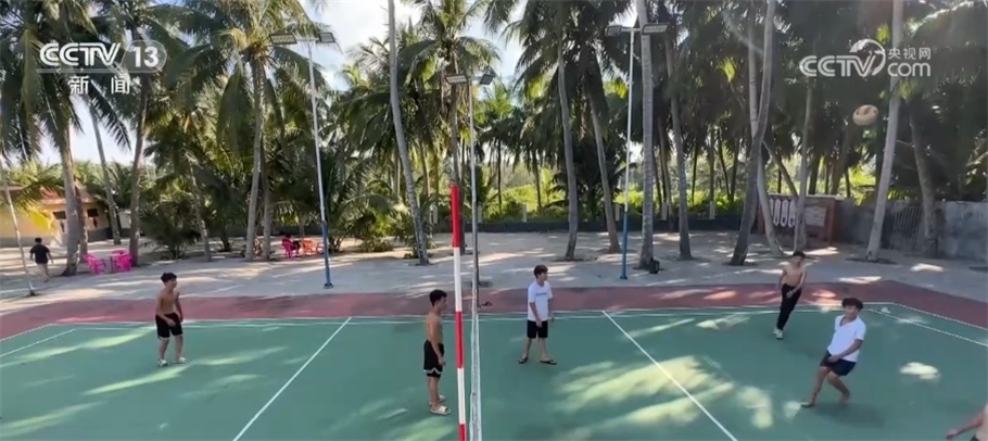 這塊掩映在椰林中的球場,是文昌市東郊鎮(zhèn)椰海村排球場,這是一塊標準大小的場地,球網(wǎng)、邊線一應(yīng)俱全。傍晚時分,天氣還比較炎熱,球場上已經(jīng)有不少孩子在打球。