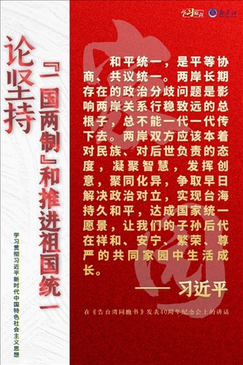 解決臺(tái)灣問(wèn)題、實(shí)現(xiàn)祖國(guó)完全統(tǒng)一,是中國(guó)共產(chǎn)黨矢志不渝的歷史任務(wù),是全體中華兒女的共同愿望,是實(shí)現(xiàn)中華民族偉大復(fù)興的必然要求。必須堅(jiān)持貫徹新時(shí)代黨解決臺(tái)灣問(wèn)題的總體方略,牢牢把握兩岸關(guān)系主導(dǎo)權(quán)和主動(dòng)權(quán),堅(jiān)定不移推進(jìn)祖國(guó)統(tǒng)一大業(yè)。