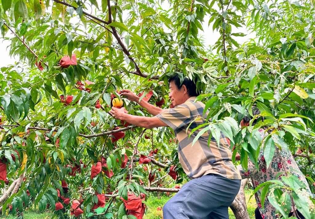 8月2日,在冷水江市三尖鎮(zhèn)光明村,農(nóng)戶正在采摘黃桃。新華社記者謝奔 攝