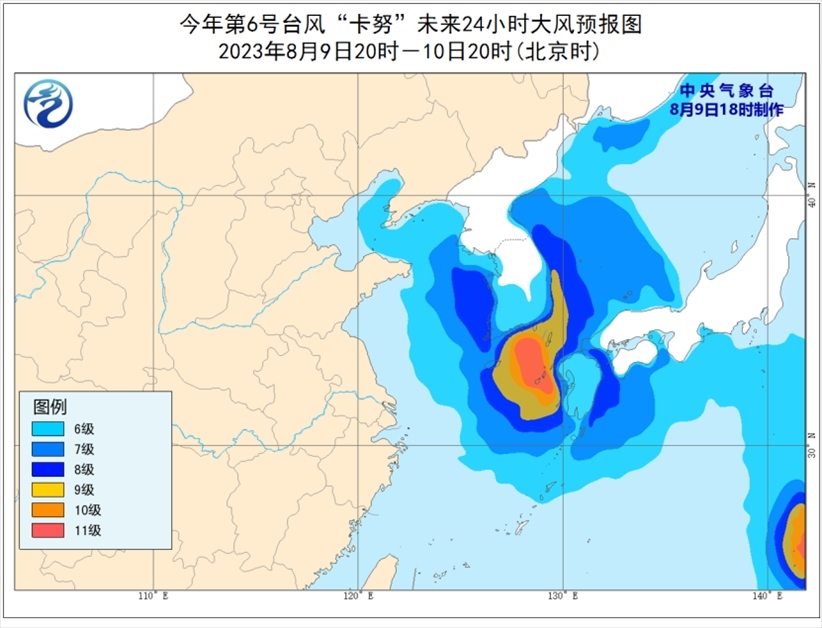 9日20時至10日20時,渤海東部、渤海海峽、黃海大部海域、東海東部海域?qū)⒂?-7級、陣風(fēng)8-9級的大風(fēng),其中黃海中部和南部偏東海域、東海東北部偏東海域風(fēng)力可達8-9級,“卡努”中心經(jīng)過的附近海域風(fēng)力可達10-11級、陣風(fēng)12-13級;遼東半島沿岸也將有5-6級大風(fēng),陣風(fēng)可達7-8級。
