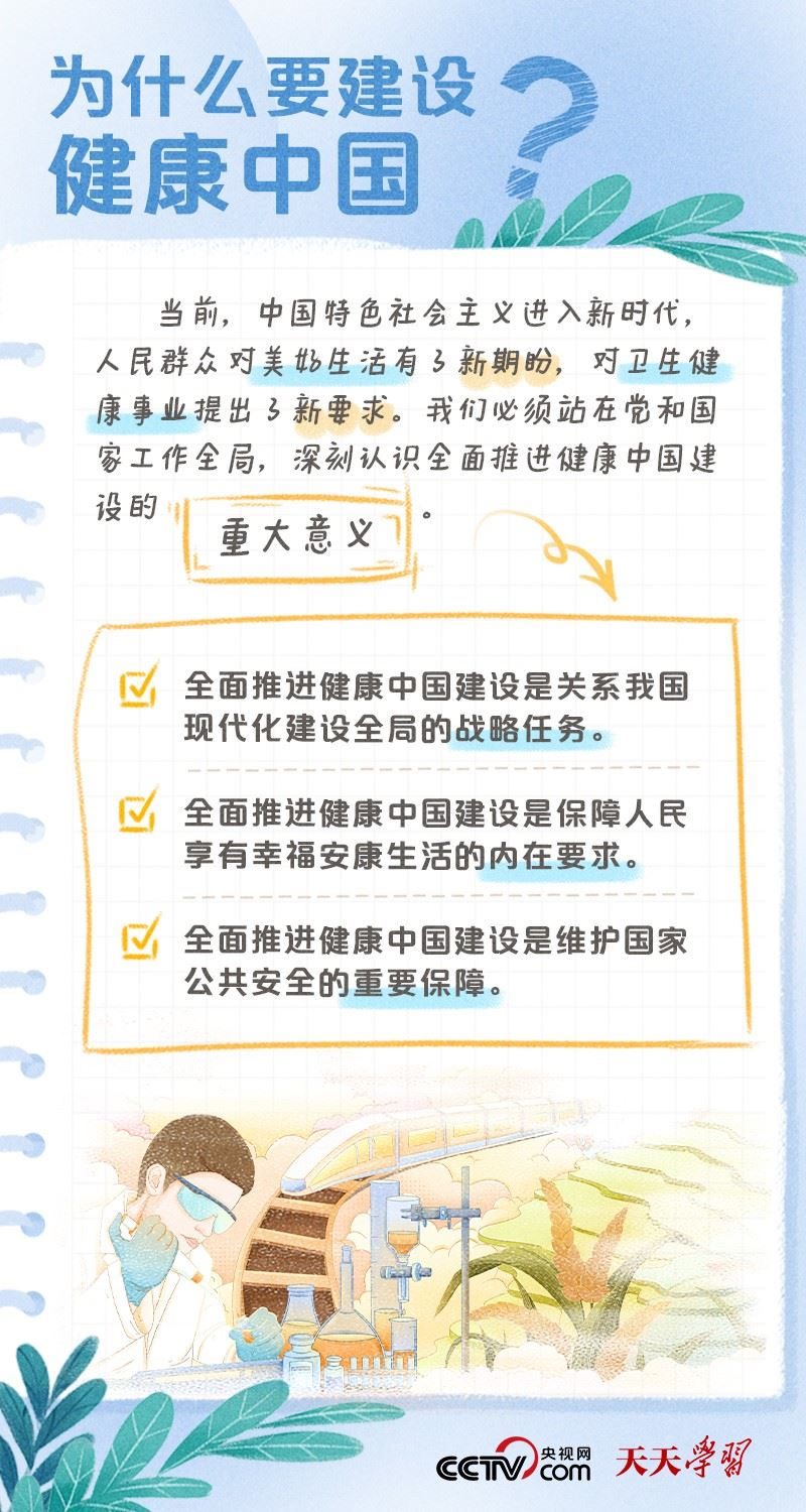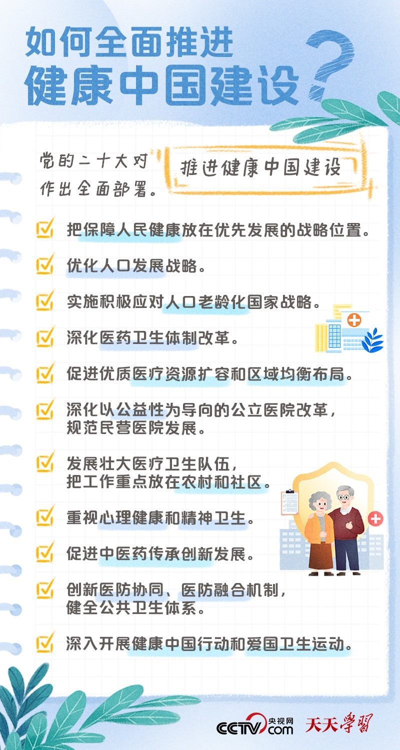 黨的二十大報(bào)告將“建成健康中國(guó)”作為到2035年我國(guó)發(fā)展的總體目標(biāo)之一,并指出,人民健康是民族昌盛和國(guó)家強(qiáng)盛的重要標(biāo)志,把保障人民健康放在優(yōu)先發(fā)展的戰(zhàn)略位置,完善人民健康促進(jìn)政策。什么是健康中國(guó)?如何全面推進(jìn)健康中國(guó)建設(shè)?央視網(wǎng)《天天學(xué)習(xí)·學(xué)習(xí)筆記》特梳理相關(guān)內(nèi)容,為您解讀總書(shū)記治國(guó)理政關(guān)鍵詞——健康中國(guó)。