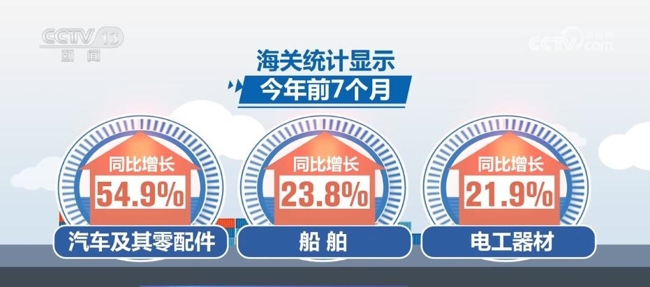 海關(guān)統(tǒng)計(jì)顯示,今年前7個(gè)月,我國機(jī)電產(chǎn)品出口占比提升,汽車及其零配件、船舶、電工器材同比分別增長(zhǎng)54.9%、23.8%、21.9%。