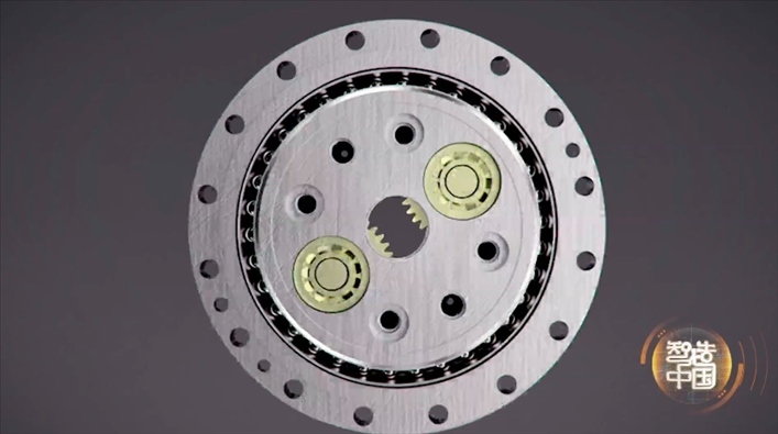 打開RV減速機(jī),里面就像一個太陽系,既有太陽輪,也有行星輪。這就是RV減速機(jī)的擺線行星輪,它們就像圍繞太陽的行星,既有自轉(zhuǎn)也有公轉(zhuǎn),自轉(zhuǎn)一圈的同時公轉(zhuǎn)40圈,通過多組行星運(yùn)動實(shí)現(xiàn)精密傳動,把電機(jī)的高速轉(zhuǎn)動降下來,同時增大轉(zhuǎn)矩,驅(qū)動機(jī)器人手臂旋轉(zhuǎn)。