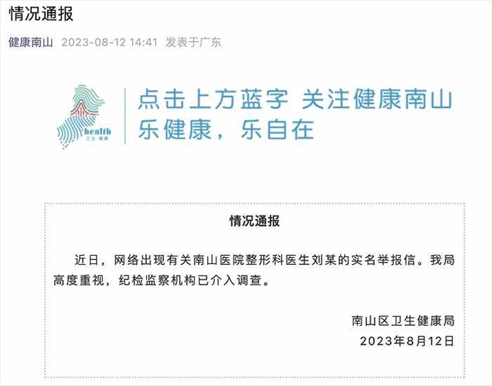 ·網(wǎng)傳南山醫(yī)院整形科醫(yī)生劉某被實(shí)名舉報,官方通報:紀(jì)檢監(jiān)察機(jī)構(gòu)已介入調(diào)查。