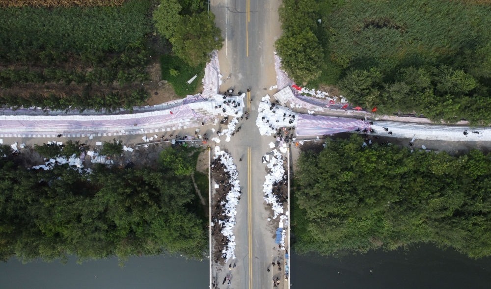 武警第一機(jī)動(dòng)總隊(duì)某支隊(duì)官兵在大清河支渠橋處搶筑堤壩(8月10日攝,無(wú)人機(jī)照片)。新華每日電訊記者趙子碩攝