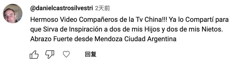 網(wǎng)友danielcastrosilvestri:“中國(guó)電視臺(tái)的朋友們,這個(gè)視頻太好看了?。?!我把它分享出去,希望它能夠給我的兩個(gè)孩子和兩個(gè)孫子帶來啟發(fā)。我來自阿根廷的門多薩市,致禮?!?/p>