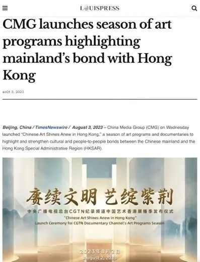 總臺(tái)CGTN在官網(wǎng)發(fā)布的《中國(guó)藝術(shù)香港展播季 讓觀眾零距離觸摸源遠(yuǎn)流長(zhǎng)的中華文明》稿件被來自美國(guó)、英國(guó)、法國(guó)、澳大利亞、韓國(guó)、加拿大、意大利等20個(gè)國(guó)家和地區(qū)的799家海外主流網(wǎng)絡(luò)媒體轉(zhuǎn)載。美國(guó)《國(guó)際日?qǐng)?bào)》《歐洲僑報(bào)》《葡新報(bào)》《非洲時(shí)報(bào)》《委國(guó)僑報(bào)》、新西蘭格局傳媒網(wǎng)站、歐僑網(wǎng)和日本華商網(wǎng)等海外華文媒體也以多種形式刊載轉(zhuǎn)發(fā)了相關(guān)報(bào)道。