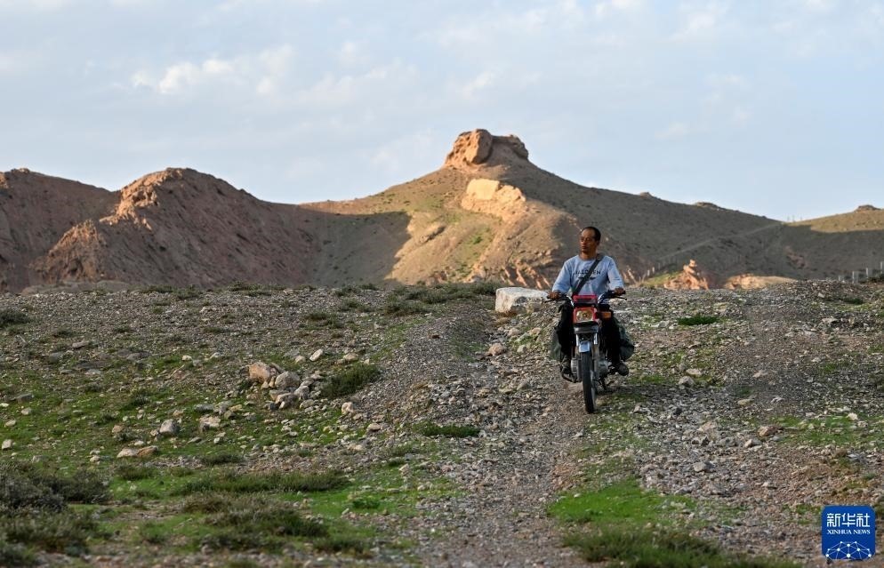 8月20日,董海寧騎摩托車巡查賀蘭山沿線的明長城永寧段。新華社記者 馮開華 攝