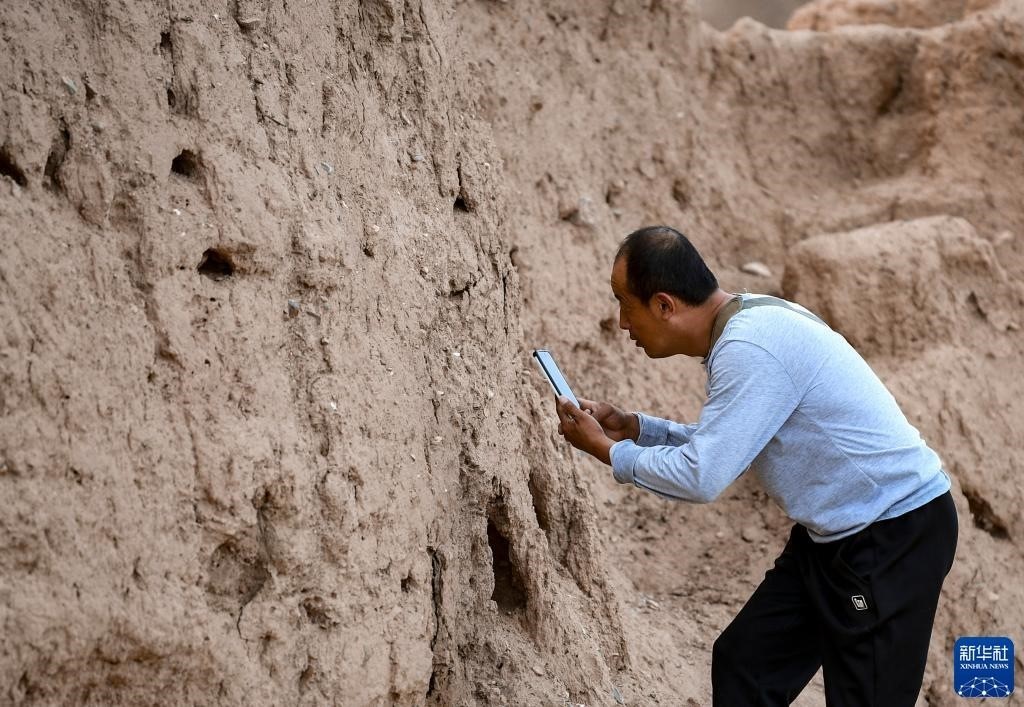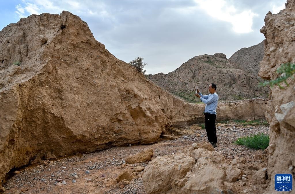 8月20日,董海寧巡查賀蘭山沿線的明長城永寧段時用手機拍照記錄。新華社記者 連振 攝