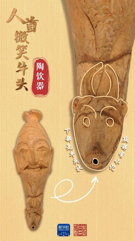 當(dāng)中國(guó)絲綢的美譽(yù)經(jīng)由古絲綢之路在西亞、歐洲等地傳揚(yáng)時(shí),西方文明也穿過(guò)風(fēng)沙與長(zhǎng)歌,在中國(guó)留下了印記。人首微笑牛頭陶飲器出土于和田地區(qū)約特干遺址,為唐代時(shí)期文物。飲器上部為人首形,下部是牛頭狀,底部帶小圓孔,上下兩部分內(nèi)腔相通。人首上唇胡須外展卷翹,面帶微笑。牛頭微微上翹,牛角豎立攏圓。這種飲器造型源自“來(lái)通”,即末端為動(dòng)物形或人首形的角杯,是小亞細(xì)亞和地中海地區(qū)常見(jiàn)的飲酒器具,絲綢之路沿線國(guó)家都有類(lèi)似文物出土。