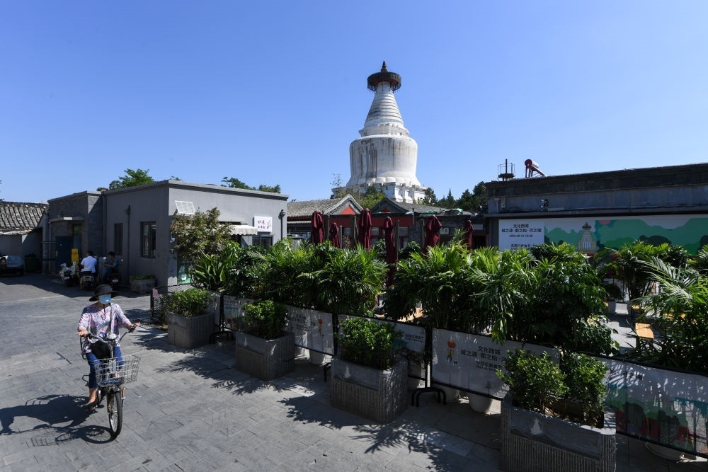 午后的北京西城區(qū)宮門口西岔胡同,居民們納涼聊天,一間間老字號燒餅店、特色咖啡廳、精釀啤酒館各成風景。抬頭望去,青磚灰瓦與紅墻綠樹之上,妙應寺白塔莊重滄桑,古樸與現(xiàn)代相映成趣。