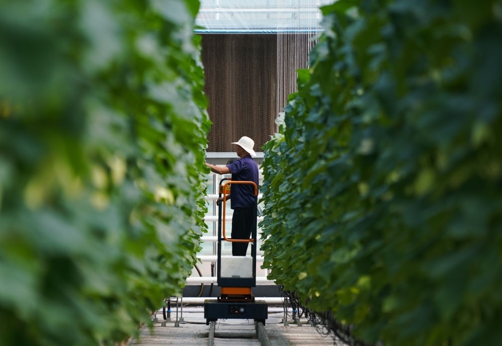 2023年7月26日,在山東濰坊壽光市丹河設(shè)施蔬菜標準化生產(chǎn)示范園,農(nóng)民在管護作物。新華社記者 張浩波 攝