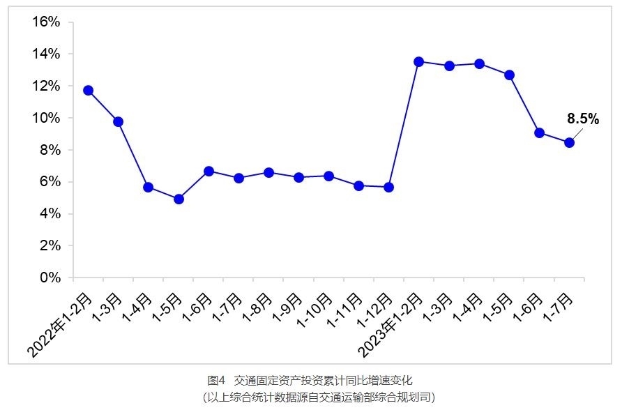 7月,完成交通固定資產(chǎn)投資3486億元,同比增長5.3%。其中,完成公路投資2548億元,同比增長3.9%;完成水運(yùn)投資168億元,同比增長20.8%。