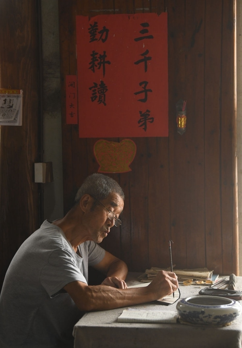 諸葛村的村民在家中寫扇面(2023年8月1日攝)。新華社記者 翁忻旸 攝