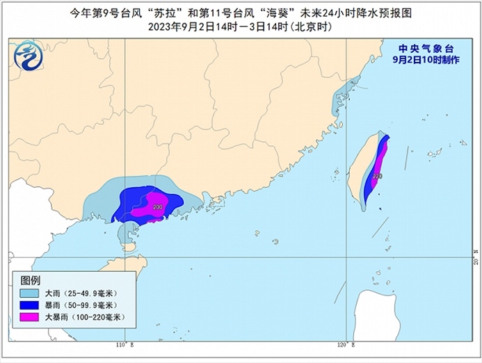 降水預報:9月2日14時至3日14時,受“蘇拉”和“海葵”影響,廣東西南部、廣西東南部、福建東北部沿海、臺灣島東部等地有大到暴雨,其中,廣東西南部、臺灣島東部等地部分地區(qū)有大暴雨(100~220毫米)。