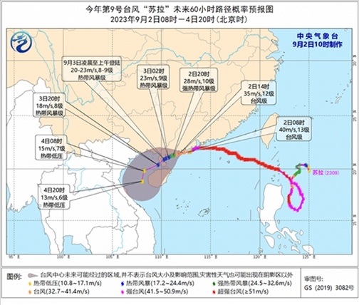 另外,今年第9號臺風“蘇拉”的中心今天(9月2日)上午8點鐘位于廣東省臺山市近海,就是北緯21.6度、東經112.7度,中心附近最大風力有13級(40米/秒),中心最低氣壓為960百帕。