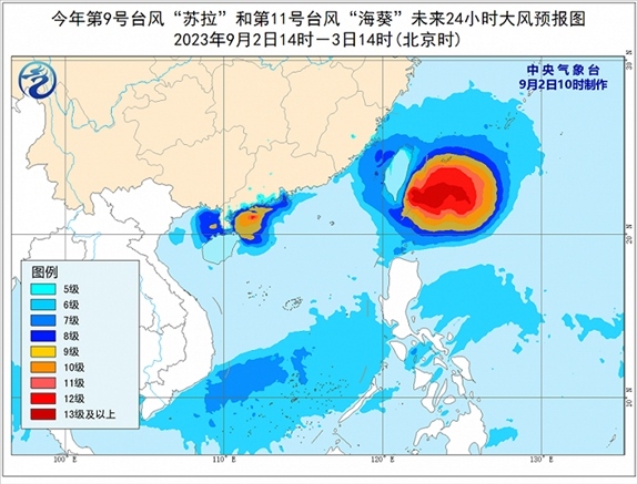 大風預報:9月2日14時至3日14時,受“蘇拉”影響,南海西北部、北部灣東部、瓊州海峽及廣東中西部沿海、廣西南部沿海、海南北部沿海、珠江口以及香港和澳門等地將有6-8級、陣風9-10級的大風,“蘇拉”中心經過的附近海面或地區(qū)風力有11-12級、陣風13-14級;受“海葵”影響,臺灣海峽、巴士海峽、浙江南部沿海、福建沿海、廣東東部沿海、臺灣島沿海將有6-8級,陣風9-10級大風,臺灣以東洋面部分海域風力可達9-12級,陣風13-14級,“??敝行慕涍^的附近海面風力可達13-16級,陣風17級及以上。