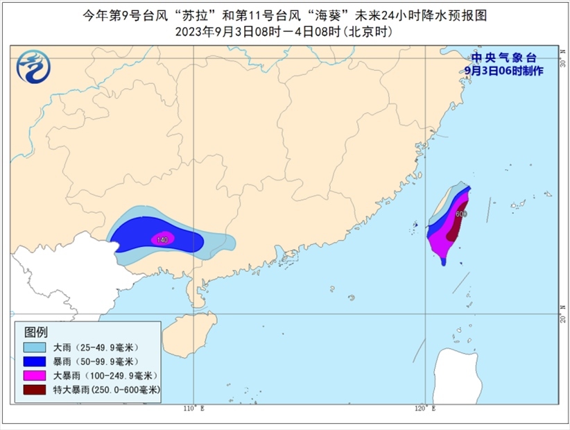 降水預報:9月3日08時至4日08時,受“蘇拉”和“??庇绊懀瑥V西中南部、廣東西南部、臺灣島等地部分地區(qū)有大到暴雨,其中,廣西中南部、臺灣島中東部等地部分地區(qū)有大暴雨,臺灣島東部部分地區(qū)有特大暴雨(250-600毫米)。