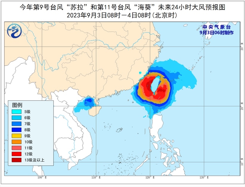 大風預報:9月3日08時至4日08時,受“蘇拉”影響,北部灣、瓊州海峽以及廣西南部沿海、海南島北部沿海等地將有6-7級大風,其中北部灣部分海域?qū)⒂?級、陣風9-10級的大風;受“海葵”影響,巴士海峽、臺灣海峽、臺灣以東洋面、東海南部及釣魚島附近海域以及浙江南部沿海、福建沿海、臺灣島沿海將有6-8級、陣風9-10級大風,部分海域或地區(qū)的風力有9-12級,陣風13-14級,“??敝行慕?jīng)過的附近海面或地區(qū)的風力有13-16級,陣風17級。