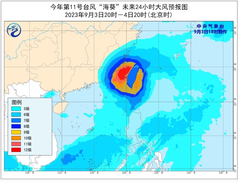 大風(fēng)預(yù)報(bào):9月3日20時(shí)至4日20時(shí),巴士海峽、臺(tái)灣海峽、臺(tái)灣以東洋面、東海南部及釣魚(yú)島附近海域、南海東北部以及浙江南部沿海、福建沿海、廣東東部偏東地區(qū)沿海、臺(tái)灣島及沿海將有6-8級(jí)、陣風(fēng)9-10級(jí)大風(fēng),部分海域或地區(qū)的風(fēng)力有9-12級(jí),陣風(fēng)13-14級(jí),“海葵”中心經(jīng)過(guò)的附近海面或地區(qū)的風(fēng)力有13-14級(jí),陣風(fēng)15級(jí)。