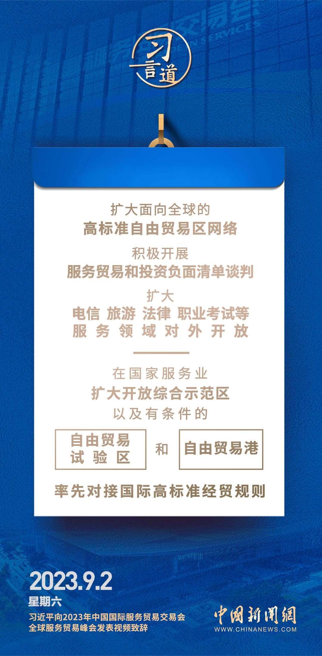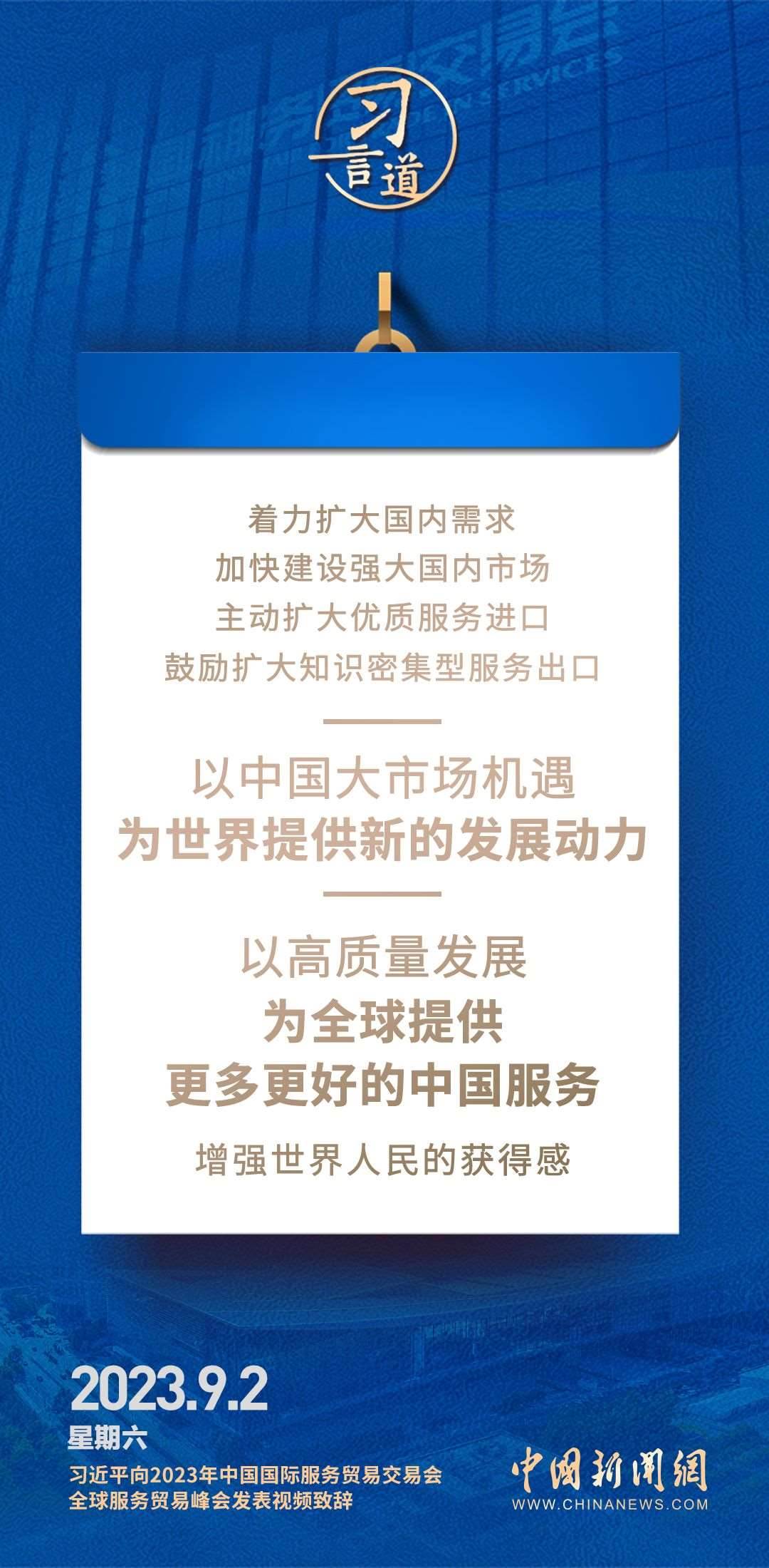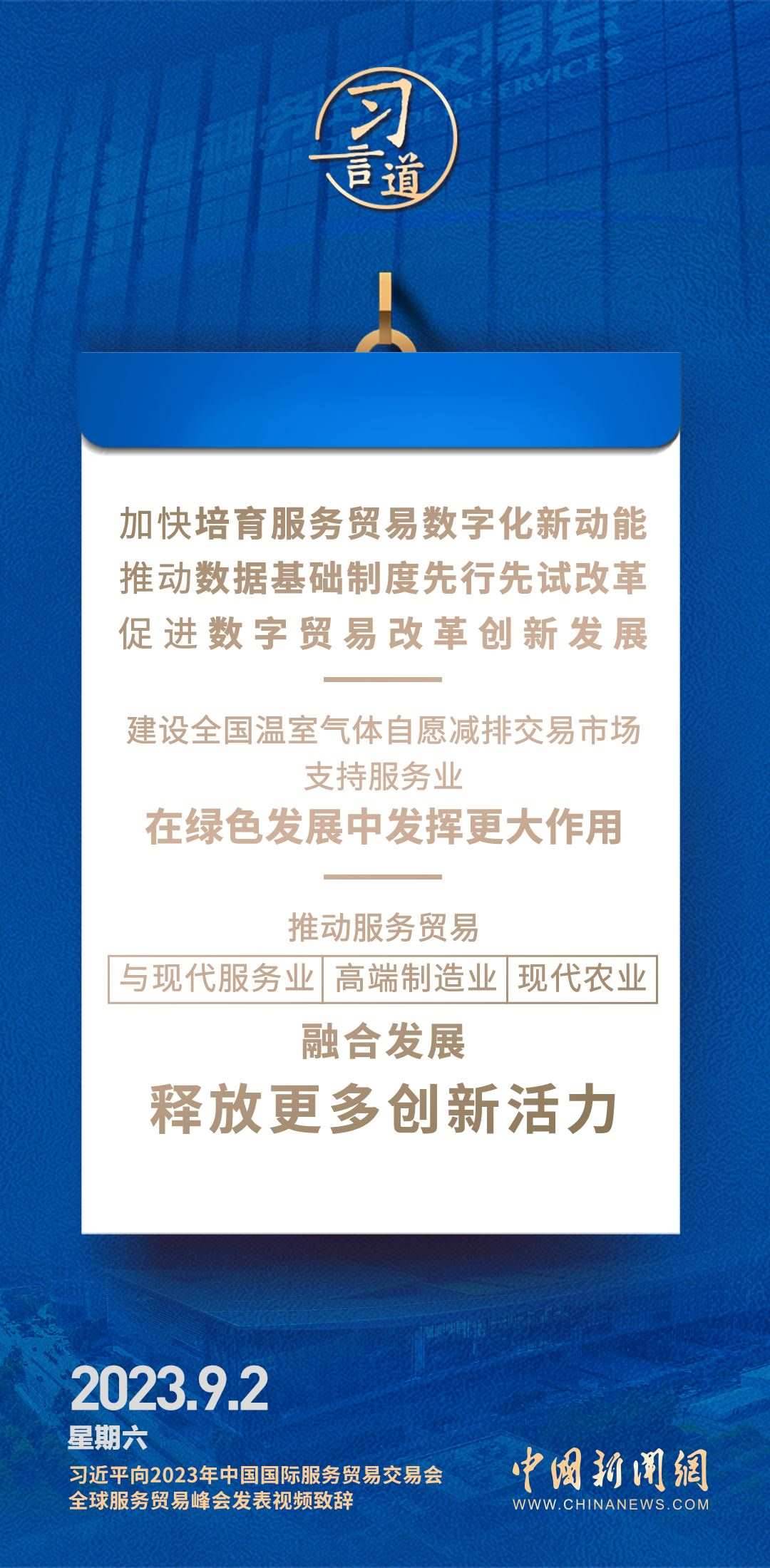 9月2日上午,國家主席習近平在北京向2023年中國國際服務貿易交易會全球服務貿易峰會發(fā)表視頻致辭。習近平指出——