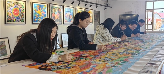 吉林省梨樹縣民間藝術(shù)家正在創(chuàng)作《關(guān)東七彩農(nóng)民畫、心系亞運(yùn)向未來(lái)》農(nóng)民畫。受訪者供圖