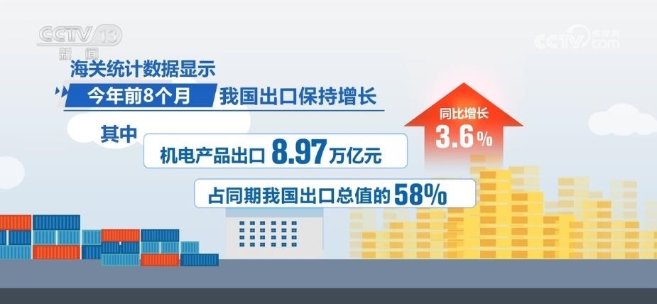 海關(guān)統(tǒng)計(jì)數(shù)據(jù)顯示,2023年前8個(gè)月,我國(guó)出口保持增長(zhǎng),其中,機(jī)電產(chǎn)品出口8.97萬億元,同比增長(zhǎng)3.6%,占同期我國(guó)出口總值的58%;汽車及零配件、船舶、電工器材出口分別增長(zhǎng)50.1%、28%、18.6%。