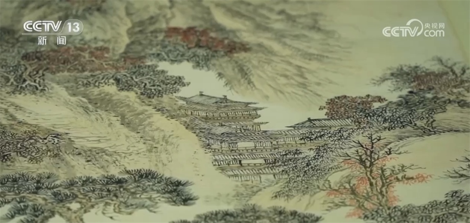 這幅《秋林書屋圖》,是清初四王之一、非常著名的畫家王翚在79歲的時候創(chuàng)作的,是珍貴的國家一級文物。這幅畫呈現(xiàn)的就是文人在山中茅屋當中讀書的一個情景。雖然300多年的時間過去了,但是展開這幅畫,我們仍然可以看到非常鮮明的色彩,蒼林翠竹與霜葉秋楓交相輝映,給我們帶來非常美的視覺享受。