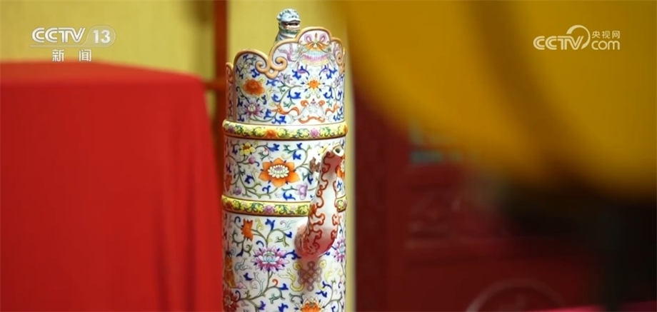 總臺記者 楊雪:沈陽故宮當中的很多珍貴院藏文物都見證了多民族文化融合的過程,像我們眼前看到的這款清乾隆款粉彩多穆壺就是其中之一。多穆在藏語當中是奶茶桶的意思,直到現(xiàn)在,像銅制、木制、皮質的很多多穆壺仍然被蒙、藏等少數(shù)民族沿襲使用著。大家可以看到,這款多穆壺的蓋子上蹲坐著一只非常靈動的小獅子,有祈福和護佑主人的意思。這件多穆壺是國家一級文物,距今已經有200多年的歷史了。