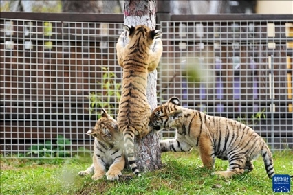 位于黑龍江省海林市的橫道河子?xùn)|北虎林園是世界最大東北虎人工飼養(yǎng)繁育基地,10月1日,園中幼虎在草地上玩鬧。