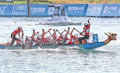 10月4日,杭州亞運會龍舟項目女子組12人龍舟200米直道競速賽,中國體育代表團選手在比賽中。新華社記者 孟晨光攝