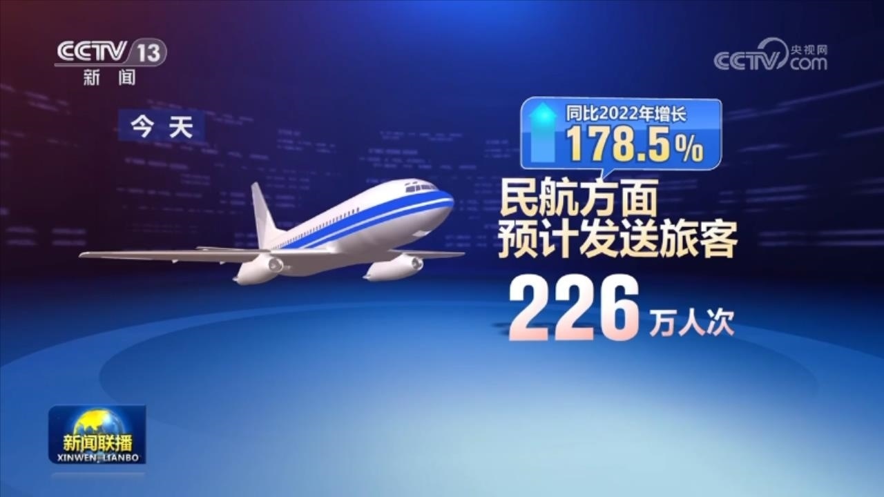 民航方面,今天預(yù)計(jì)發(fā)送旅客226萬人次,同比2022年增長(zhǎng)178.5%。全國水路預(yù)計(jì)發(fā)送旅客115萬人次,同比2022年增長(zhǎng)164.62%。