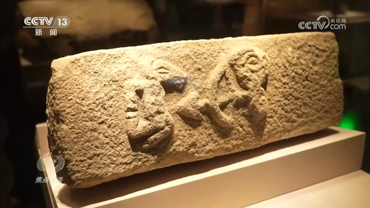 龜甲出土于河南省漯河市舞陽縣賈湖遺址,當(dāng)時遺址內(nèi)發(fā)現(xiàn)17例刻在龜甲、骨器上的符號,內(nèi)容都與占卜相關(guān),被稱為賈湖刻符。符號圖畫為我們揭開了祖先們當(dāng)時的生活圖景?!叭松漶R石雕”出土于陜西榆林神木市石峁遺址,在距今約4000年前,先人們以浮雕的方式成圖,一人持弓箭射馬,弓、弦、箭一樣不少。