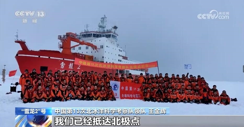 中國第13次北冰洋科學考察隊領(lǐng)隊 王金輝:中國第13次北冰洋科學考察隊隊員們,很高興地告訴大家,我們已經(jīng)抵達北極點。
